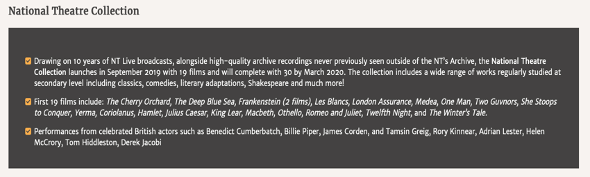 In response to the school closures caused by Coronavirus, National Theatre are offering free access to their National Theatre Collection for a temporary period. This includes:
